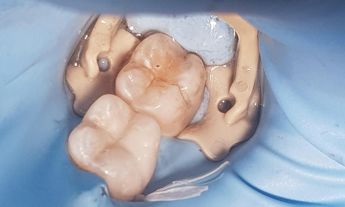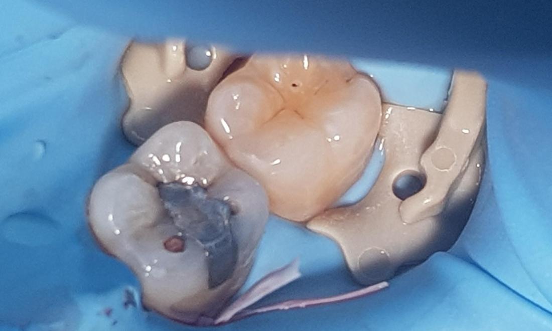 Replacement of a failing amalgam filling with tooth coloured filling material.